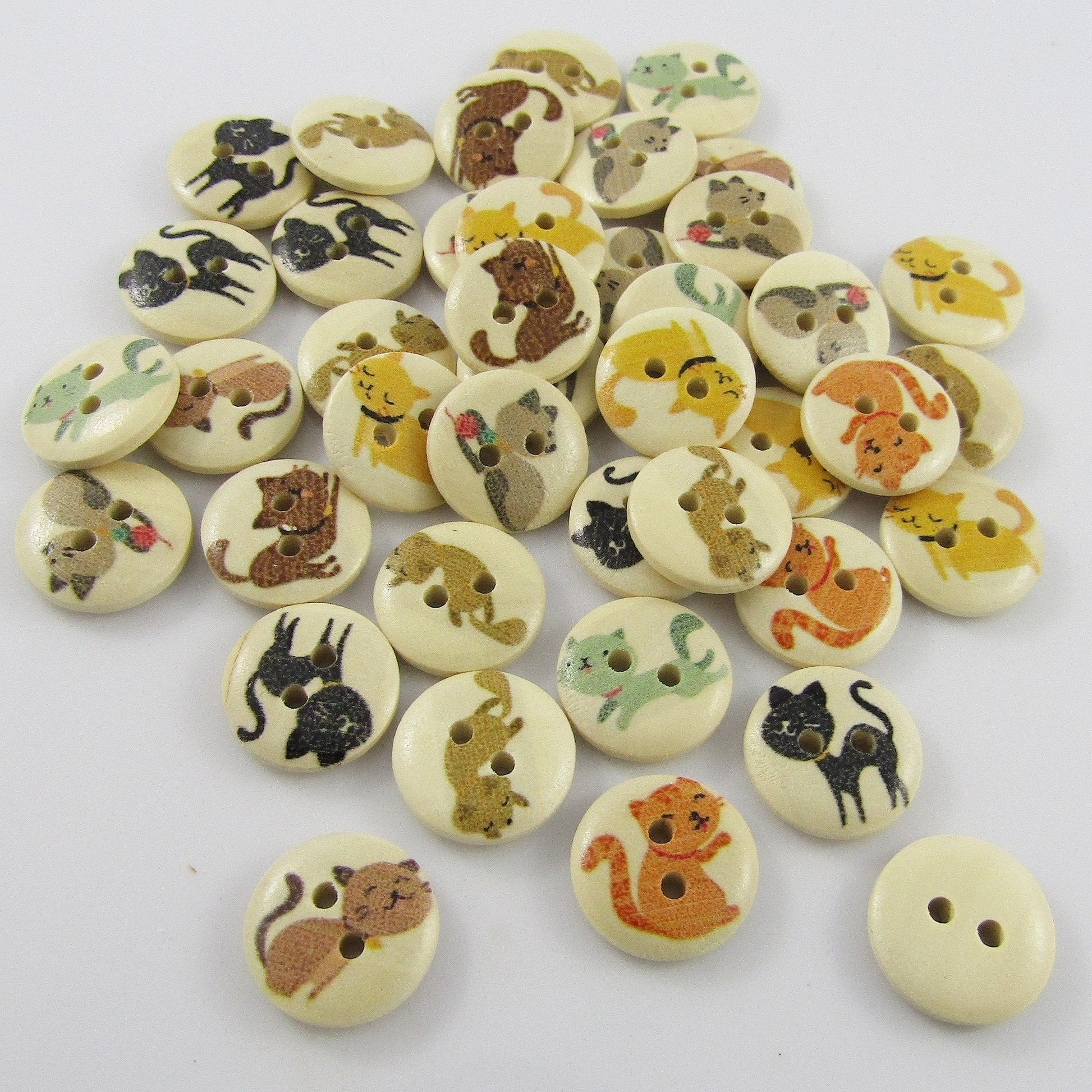 50pce Printed Cats 2 Hole Wood Button Round 15mm Sewing Cards Junk Journal etc