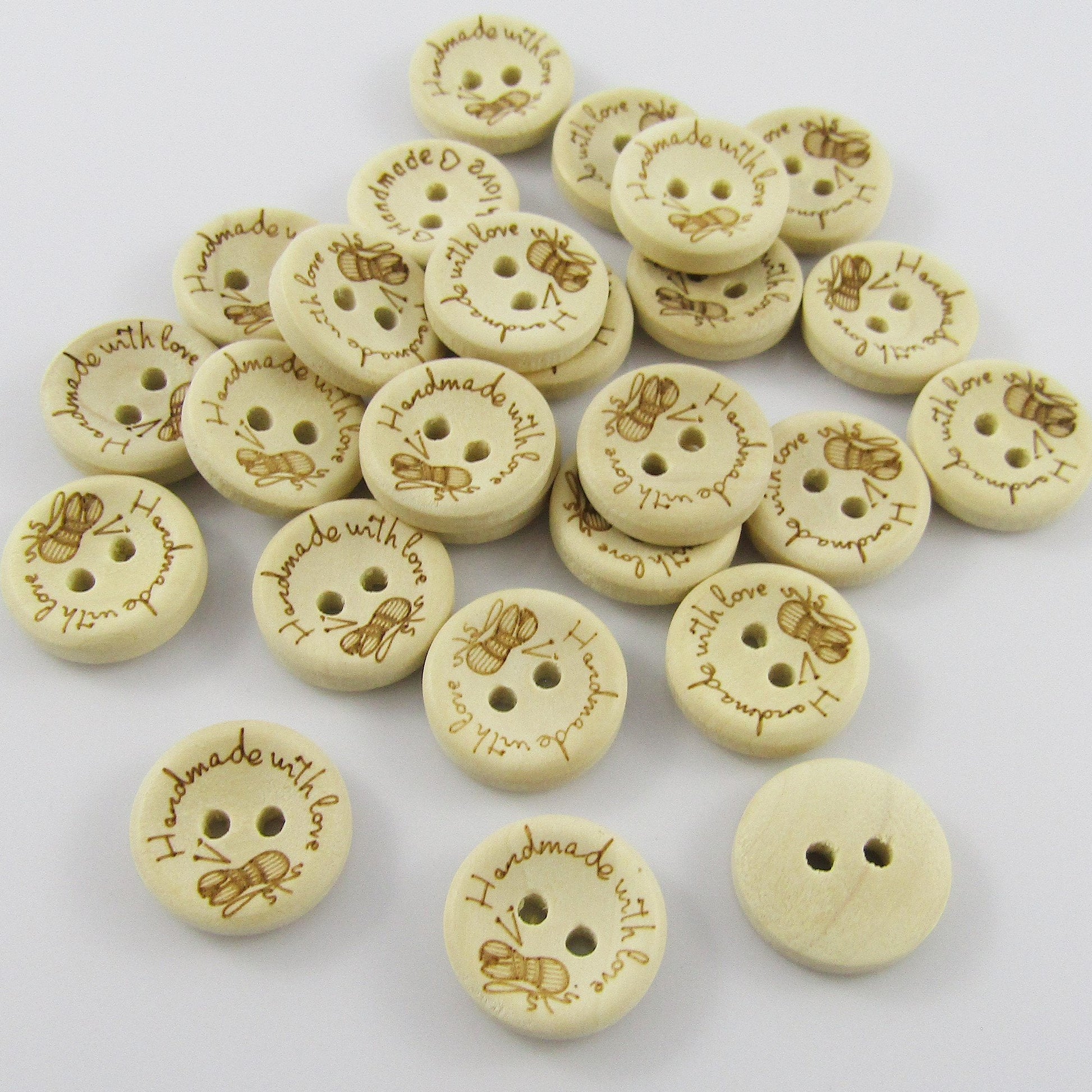 50pce Printed Knitting Hand Made with Love 2 Hole Wood Button Round 15mm Sewing